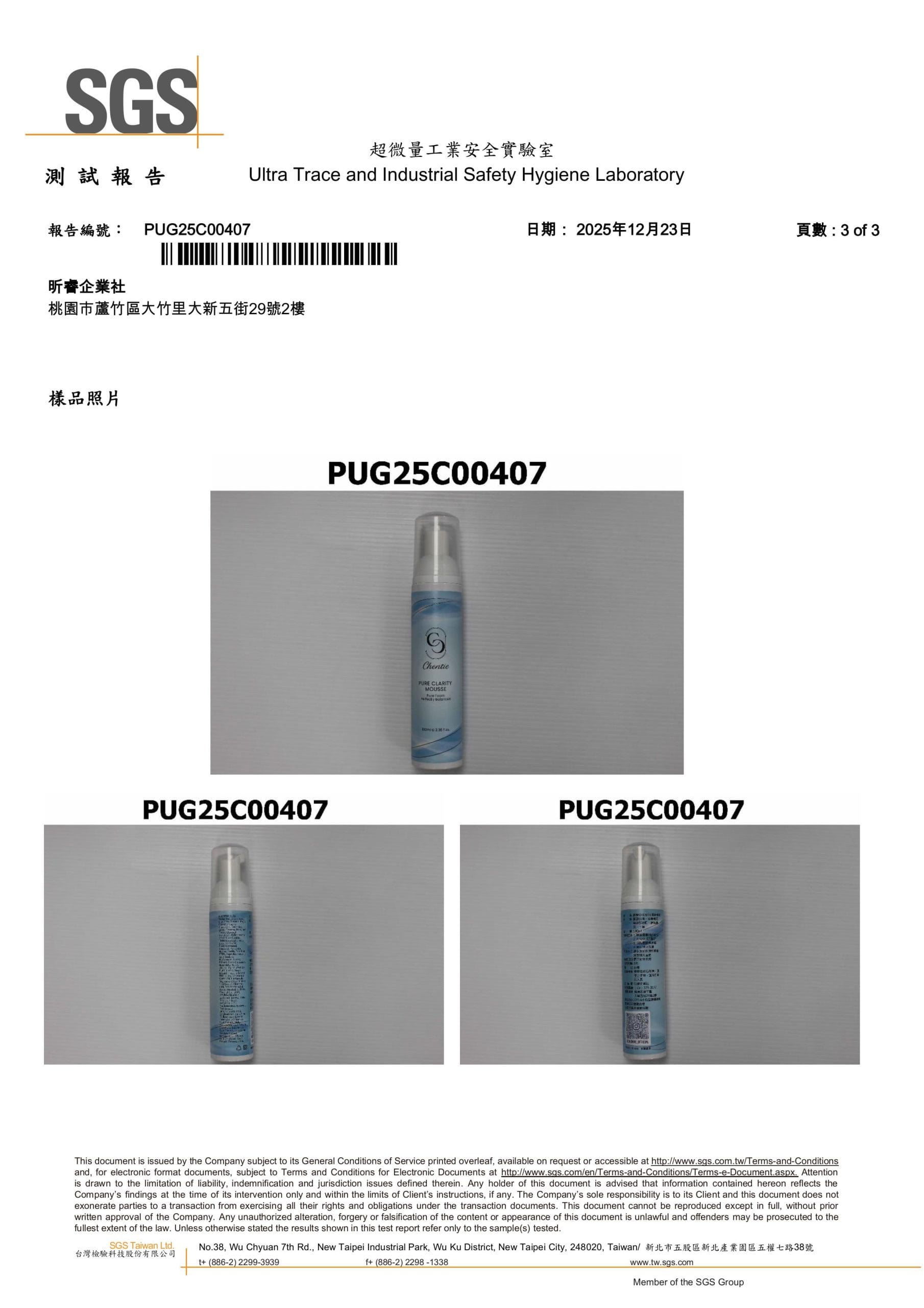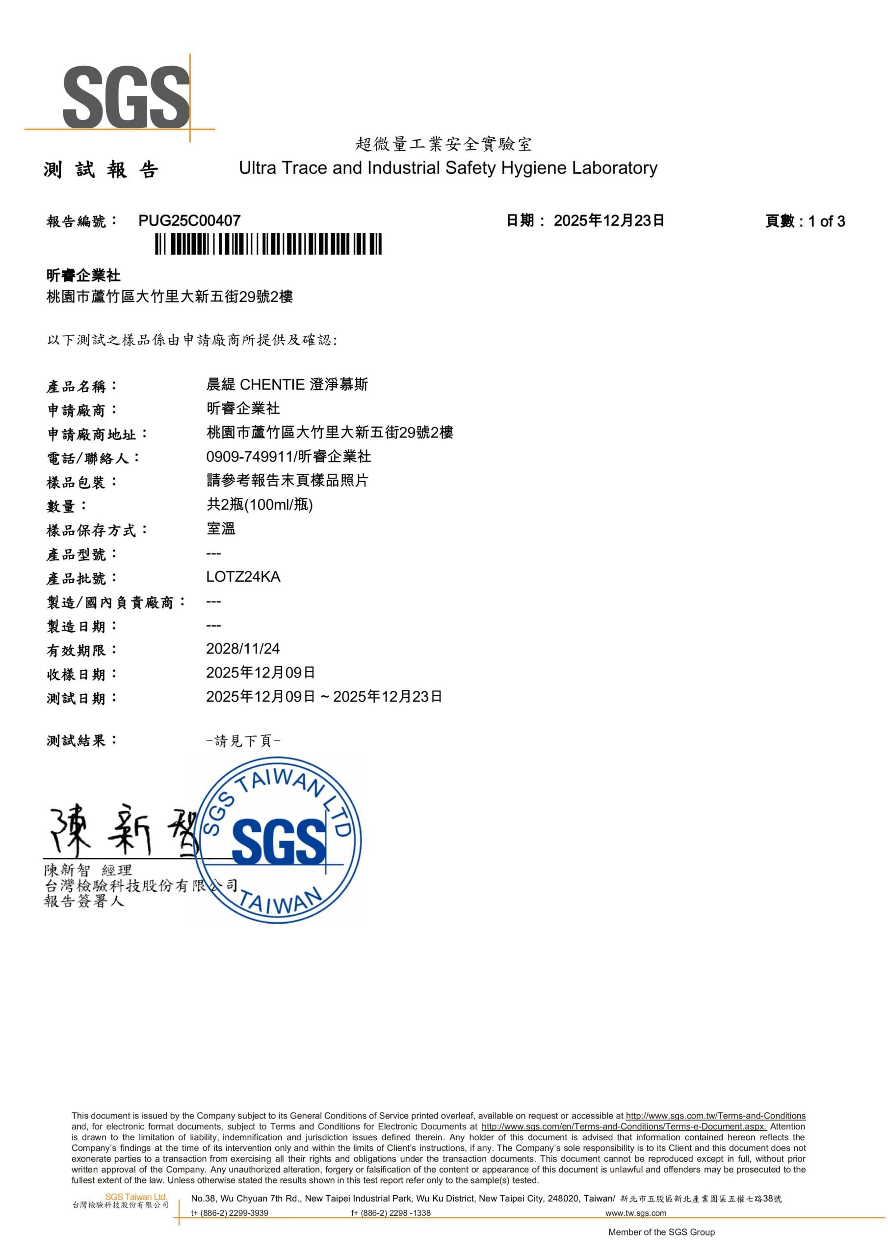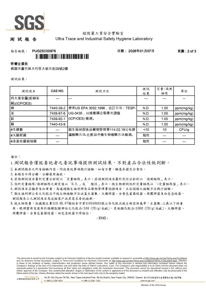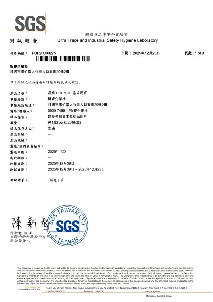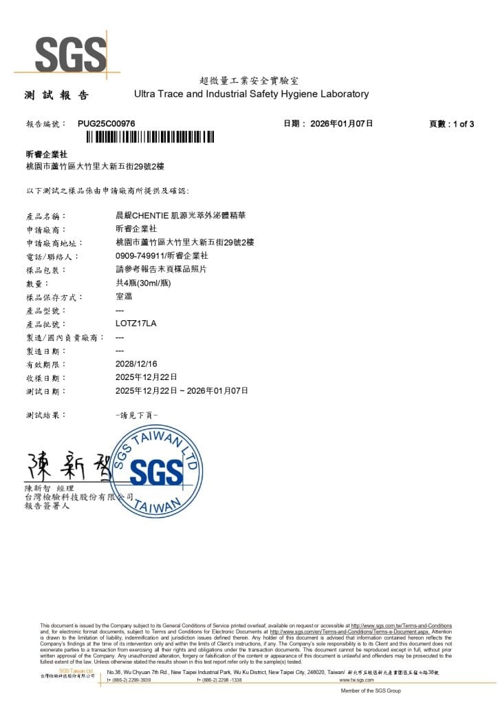 通過 SGS 檢驗的安心承諾2026 年 1 月 4 日產品檢驗晨緹CHENTIE 堅守品質把關真正的呵護來自安心與透明,晨緹CHENTIE 確保每一位消費者,都能在安全無虞的前提下,安心使用 晨緹CHENTIE 的產品,保持肌膚亮麗。所有產品皆通過 SGS 檢驗,從成分到製程層層把關,只為確保每一次使用都安全可靠。以溫柔而不妥協的標準,守護日常所需,讓呵護回歸最純粹的本質。【晨緹CHENTIE 澄淨慕斯 SGS】 【晨緹CHENTIE 晶采潤妍 SGS】 【晨緹CHENTIE 淨顏粒 SGS】 【晨緹CHENTIE 肌源光萃外泌體精華 SGS】